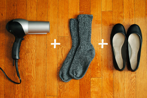 - Chuẩn bị một chiếc máy sấy và một đôi tất. Đầu tiên bạn đi tất dày vào và xỏ vào đôi giày chật. Sau đó dùng máy sấy, sấy lên đôi giày một vài phút rồi giữ nguyên như thế cho tới khi nguội dần. Bằng cách này bạn sẽ giúp đôi giày giãn ra chút ít đấy.